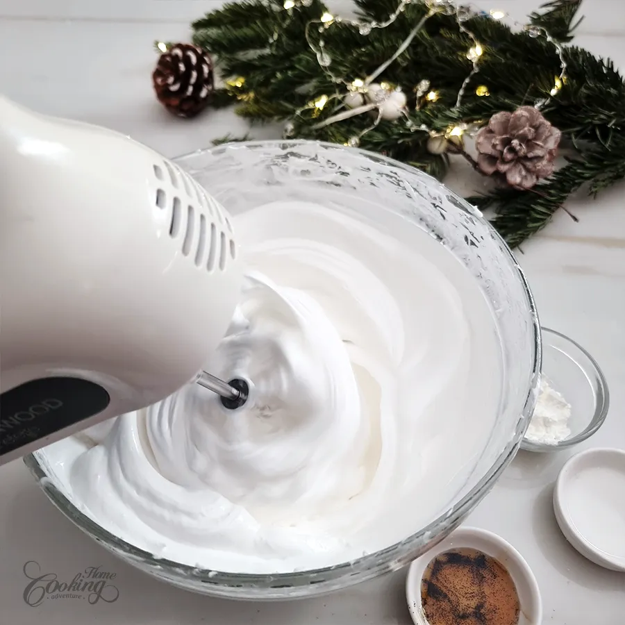 - Continue beating for 5–7 minutes, until the meringue is very stiff and glossy and is holding sharp peaks.