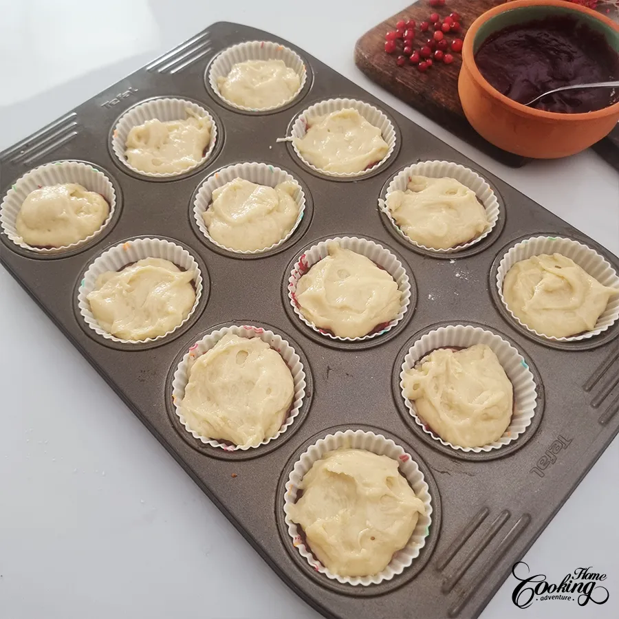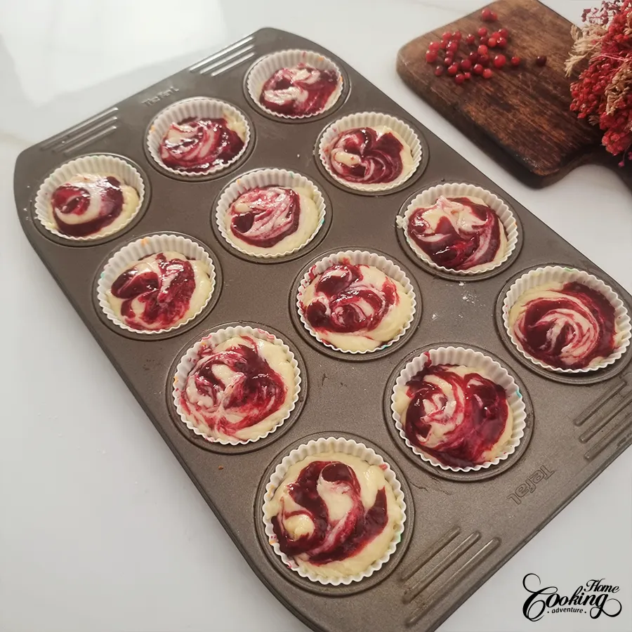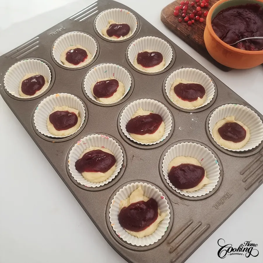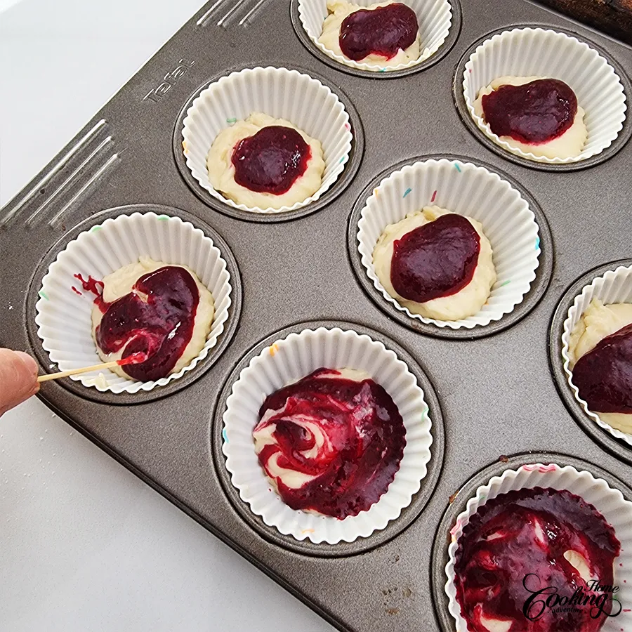 Divide the rest of the batter evenly among the cups. Top again with 1 teaspoon of cranberry sauce per muffin and swirl gently.
