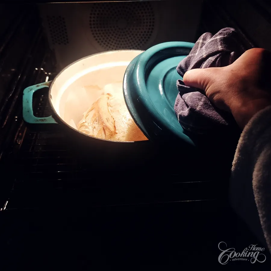 • Preheat the oven to 470°F (240°C) with either a baking stone or a 9-inch (23cm) Dutch oven inside. In case you don't have any, simply use a baking sheet, and preheat for at least 30 minutes before baking (If using the baking stone or the baking sheet place a small pot with water at the base of the oven to create steam, the Dutch oven does not need it as the lid will create enough steam.)