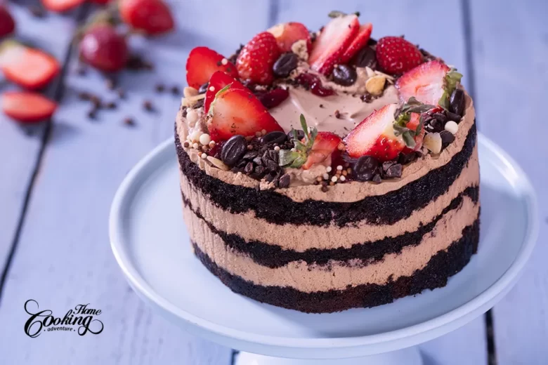 Pastel en Capas de Chocolate con Fresas y Café