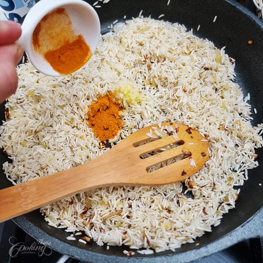 Aumenta ligeramente el fuego a medio–medio alto. Remueve el arroz solo en el centro durante 2–3 minutos hasta que esté ligeramente dorado y con aroma a nuez.