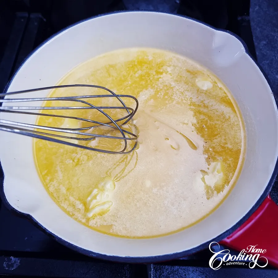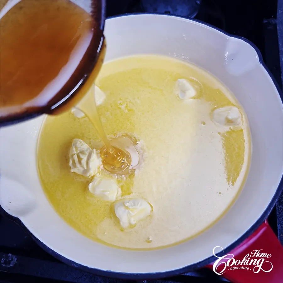 Begin with preheating the oven to 350°F (180°C). Place the butter in an 8-inch (20cm) cast-iron skillet and melt it gently over low heat. Once almost fully melted, add the honey and stir until well combined.