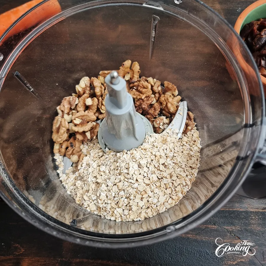 Add the oats and cooled nuts to a food processor and pulse a few times until you achieve a coarse, crumb-like texture. You’re aiming for a bit of texture here, not a fine flour.