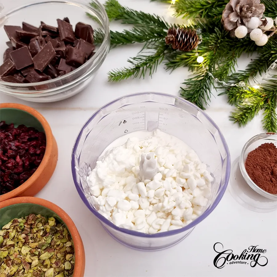 I know cottage cheese in fudge sounds strange, but trust me, once it’s blended smooth and mixed with melted chocolate, it turns into the most velvety, silky mixture. And then the Christmas flavors step in: cranberries for a little burst of sweetness and pistachios for crunch and color. It’s festive without being complicated, indulgent without being heavy.