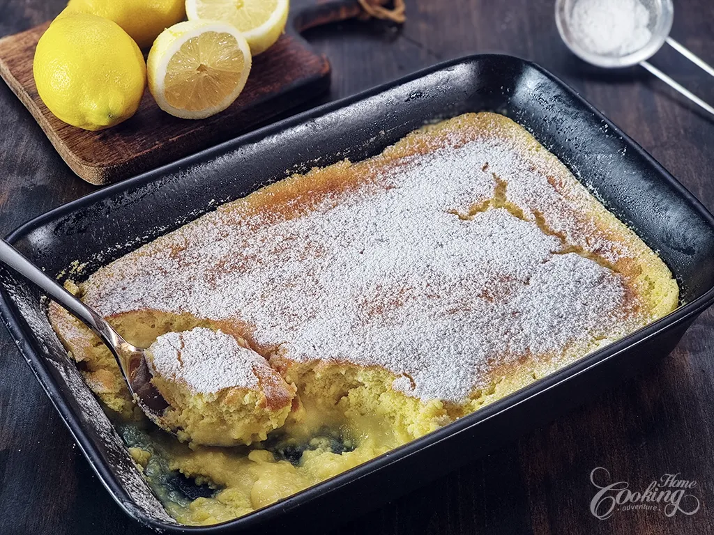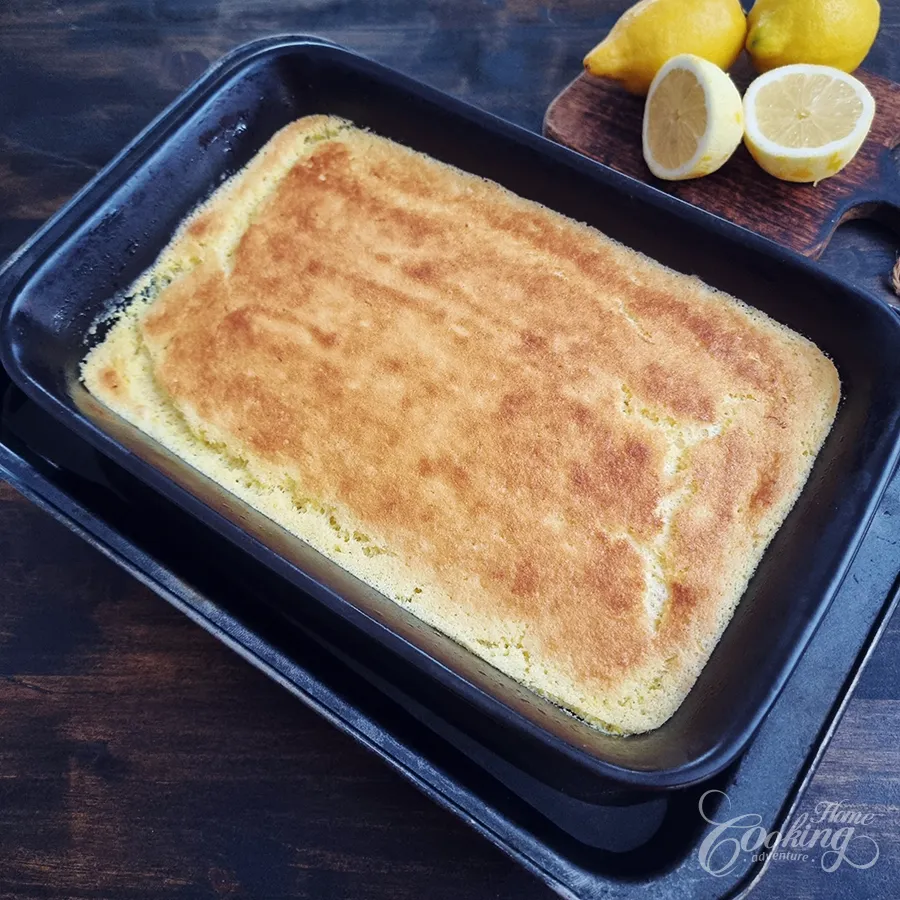 As it bakes, the cake forms two delicate layers: a light sponge on top and a soft, custard-like base underneath. It creates a beautifully textured dessert with a bright lemon flavor that feels both comforting and elegant.