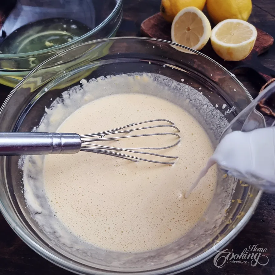 It’s made with fresh lemon juice and zest, so the flavor is bright and fresh. It is not too sweet, just the right amount of tang. The batter is very thin before baking, but don’t worry, that’s exactly what makes the texture work.