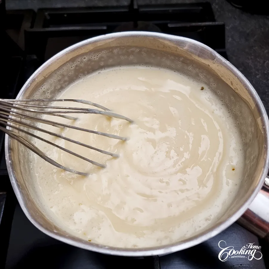 Gradually pour the warm milk into the egg mixture, whisking continuously, then return everything to the saucepan. Cook over medium heat, stirring constantly, until the mixture comes to a boil and thickens into a smooth cream.