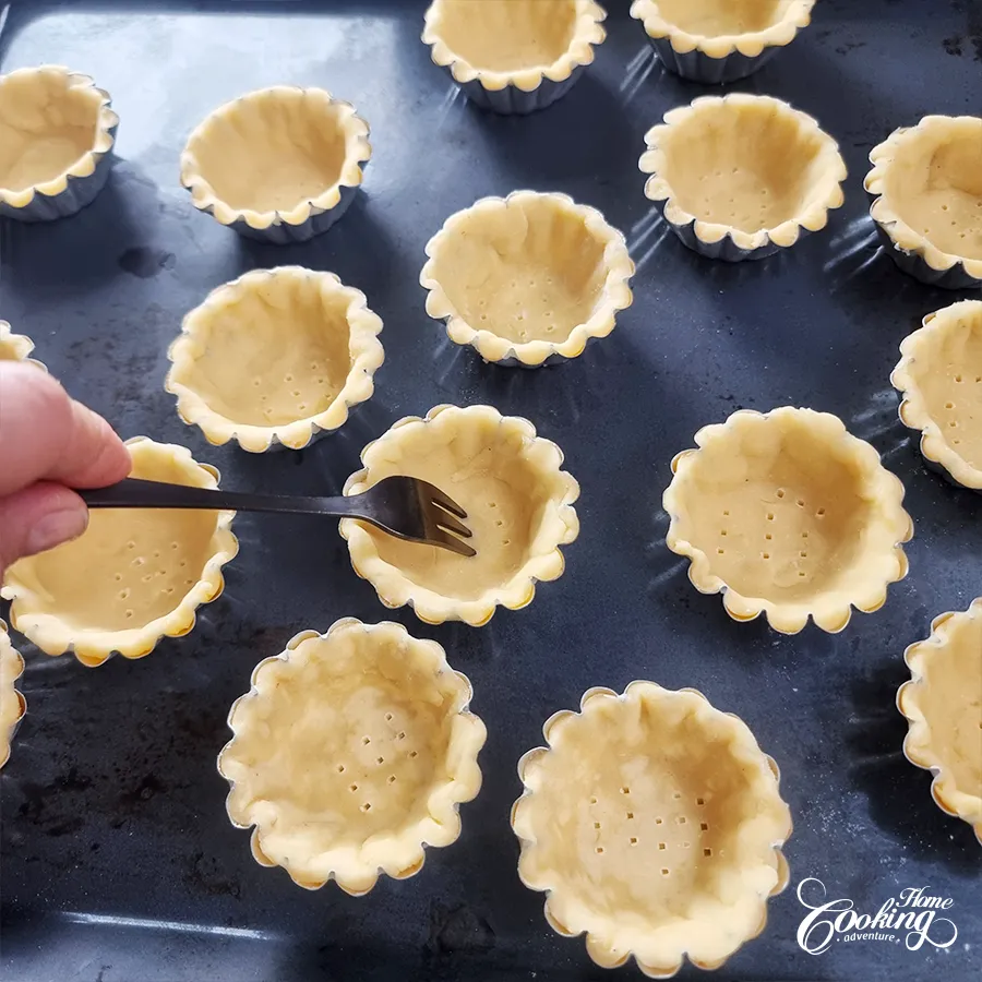 Gently press the dough into mini tart molds and freeze for 15 minutes before baking.