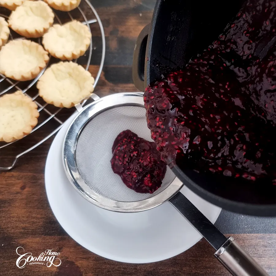 Stir in the cornstarch mixed with water and cook briefly until thickened. Remove from heat, then pass the sauce through a sieve to remove the seeds. Let it cool completely.