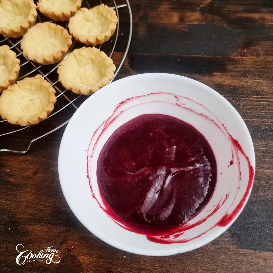 For these mini tarts, start by making the vanilla pastry cream and berry sauce so they have time to cool before filling. Continue with the pastry dough for the crust, then finish by assembling the mini tarts.