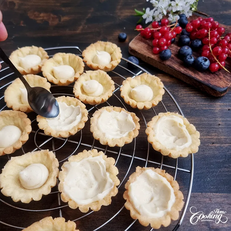 - Pipe a layer of vanilla pastry cream into each tart shell.