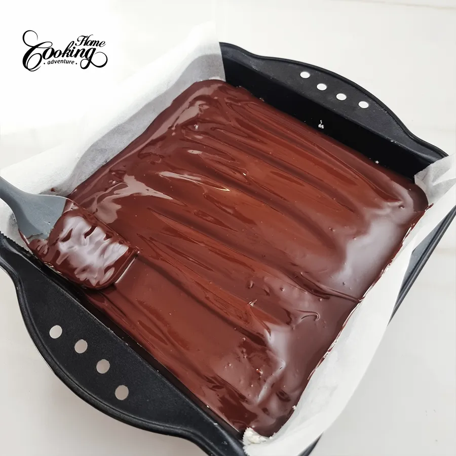 - Pour the melted chocolate evenly over the cream cheese layer and gently tilt the pan to level.