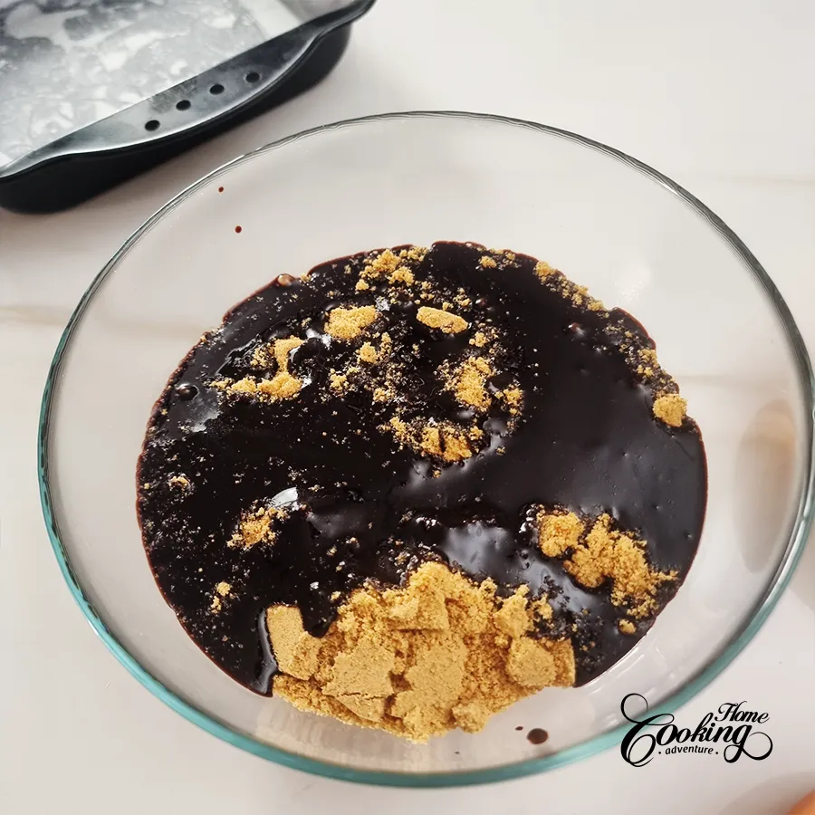 - Pour the warm chocolate mixture over the biscuit crumbs.