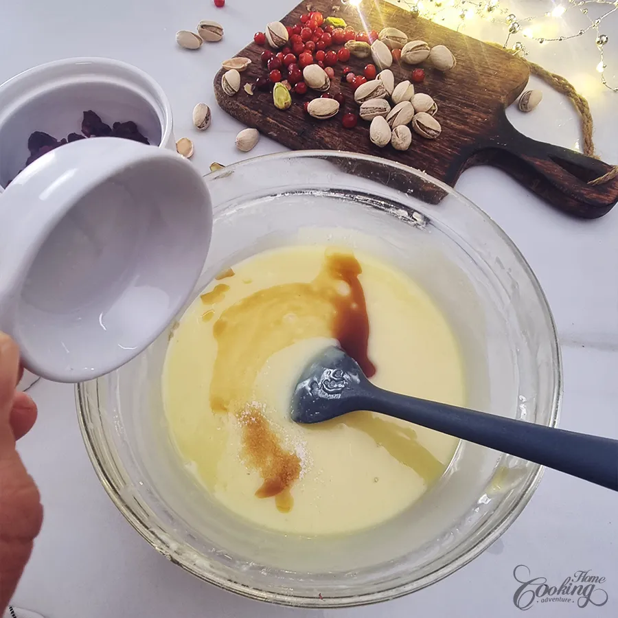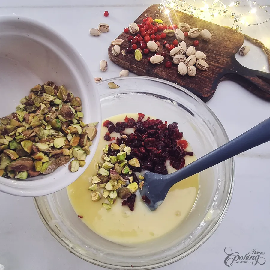 Next, fold in the pistachios and cranberries, then let the mixture cool. Cover and refrigerate for 2–3 hours, or until it becomes firm enough to roll. Give it a stir once or twice as it chills.