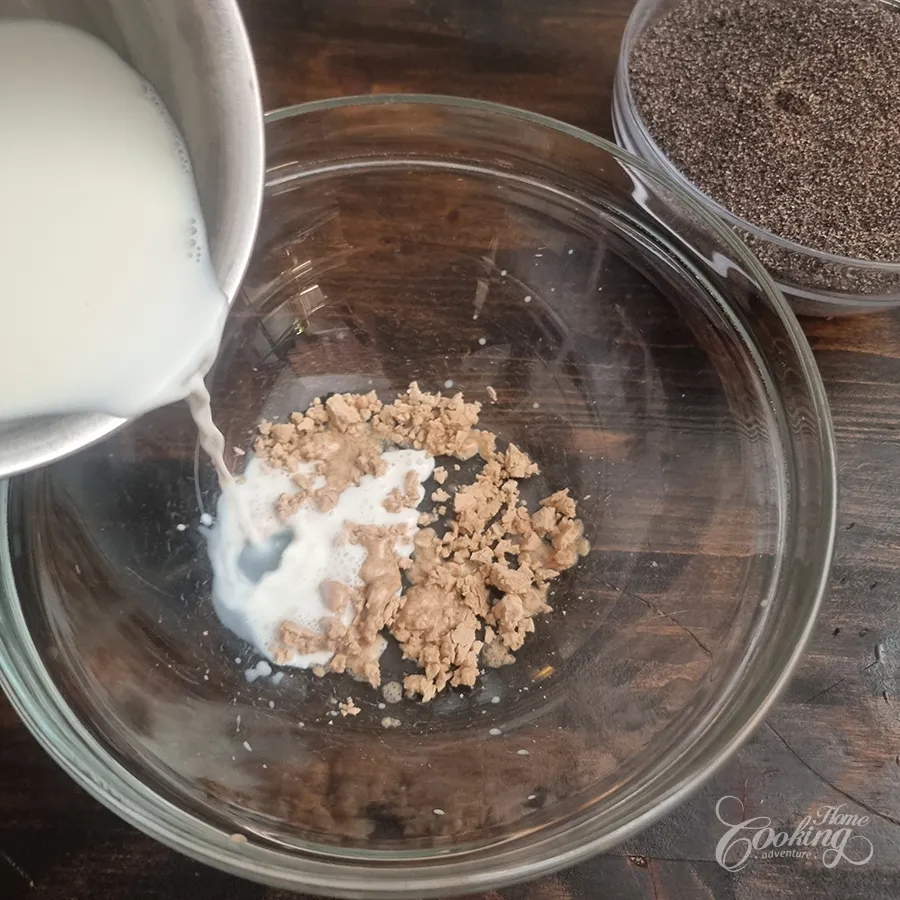 Begin with adding the yeast, 1 teaspoon of sugar, and 1/4 cup of lukewarm milk to a medium bowl. Let it rest for 5–10 minutes, until the yeast is activated and foamy.