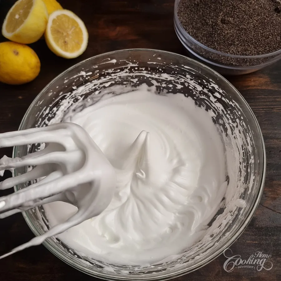 Gently fold the meringue into the poppy seed mixture in two additions, using a spatula and light movements to keep the filling airy.