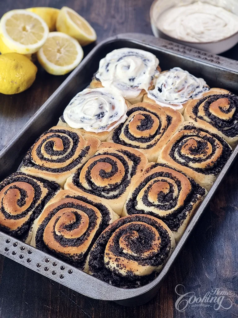 Start by preparing the dough, then let it rest while you make the poppy seed filling. Shape the rolls and leave them to rise for about 1 hour, until puffy. Bake until golden, then spread with the lemon cream cheese icing and enjoy.