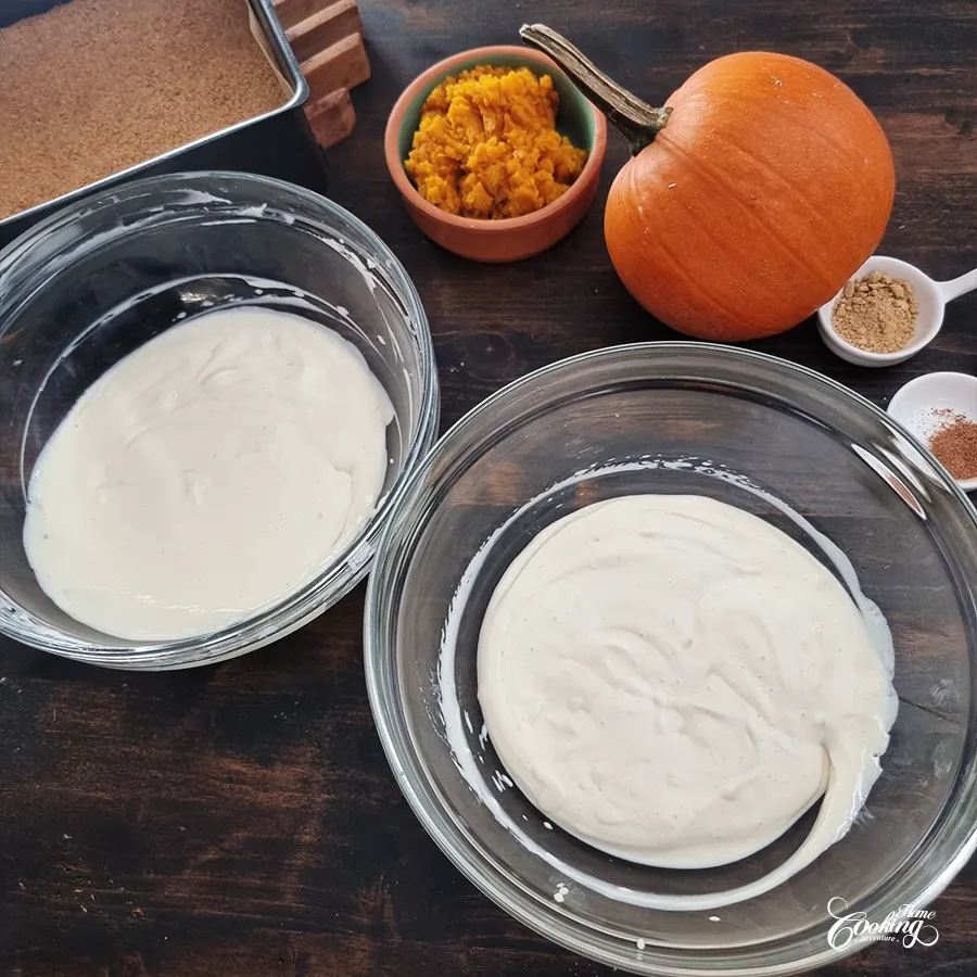 Spoon alternating dollops of the plain and pumpkin fillings over the cooled crust. Use a knife to gently swirl the two mixtures together to create a marbled design. Bake at 300°F (150°C) for 40 minutes.