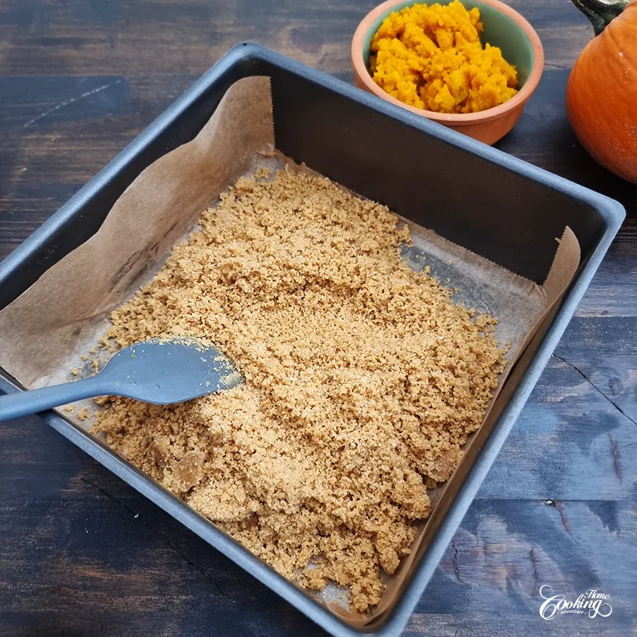 - Press the mixture into the bottom of the pan.