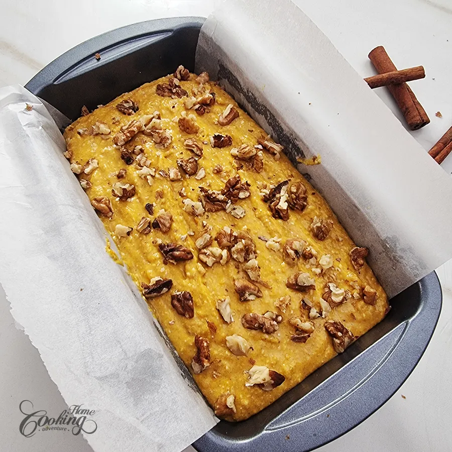 Pour the pumpkin batter into the prepared loaf pan and smooth the top. Sprinkle generously with chopped walnuts for a crunchy finish.