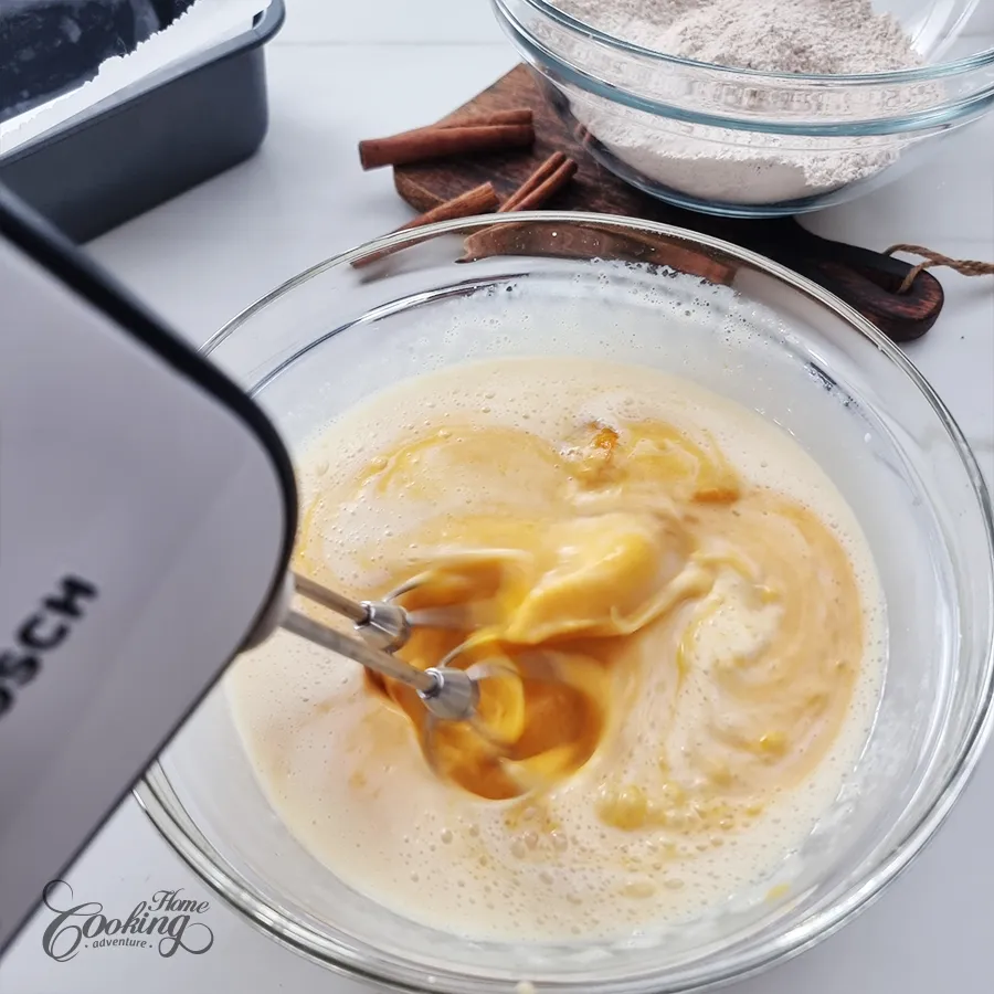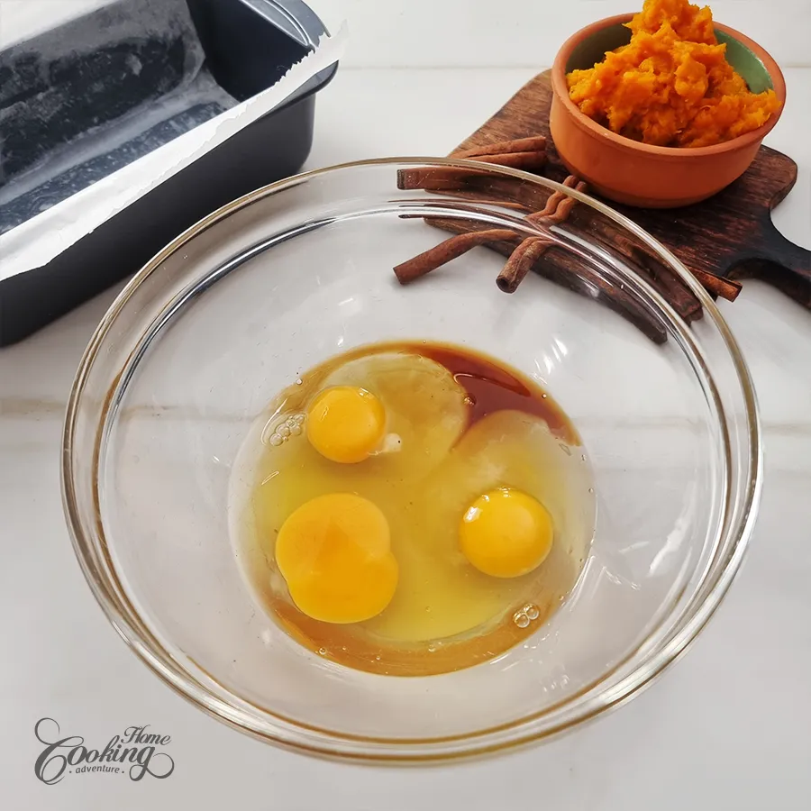 - In a large bowl add the eggs with honey/maple syrup and vanilla extract.