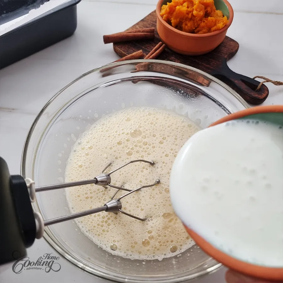 Next, whisk in the pumpkin purée until the mixture is well combined.