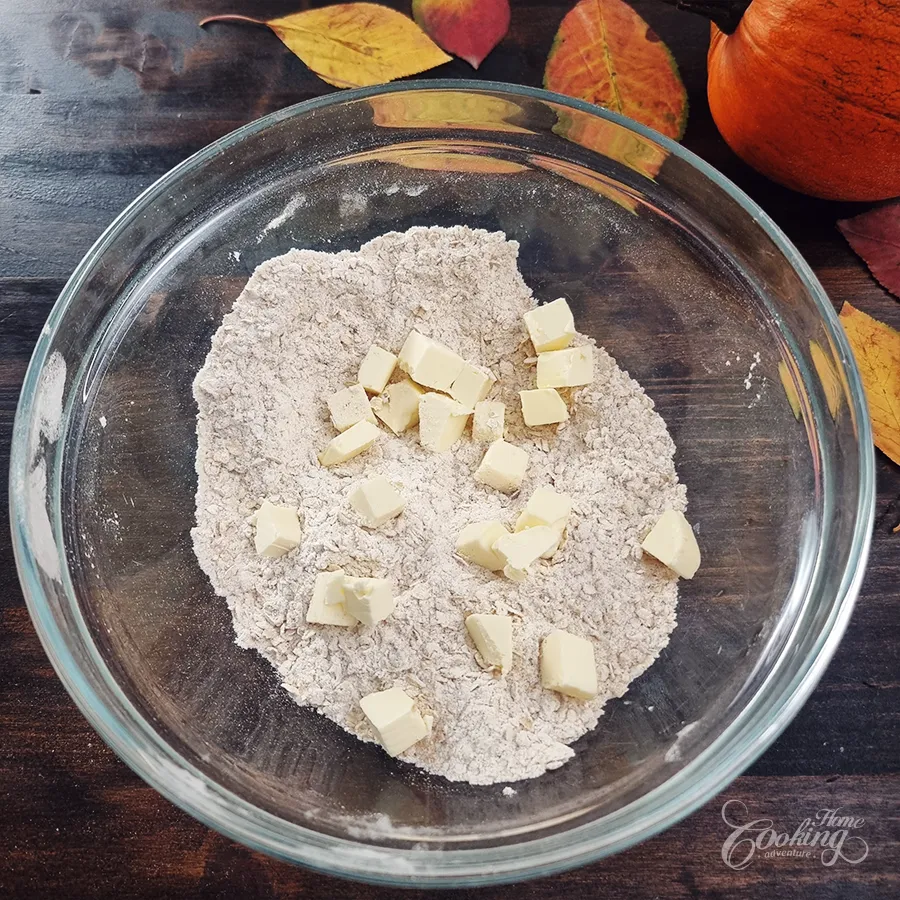 • Use a pastry cutter or fork, cut the butter until the pieces are no bigger than peas.