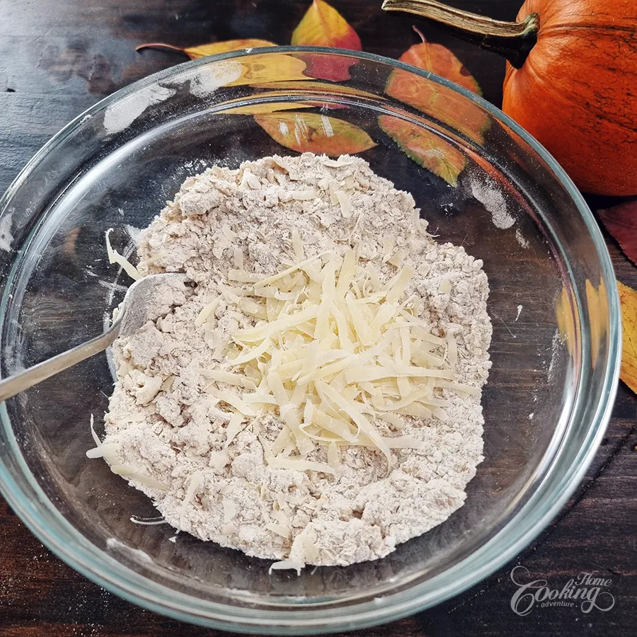 Add the cold butter and, using a pastry cutter or fork, cut it into the dry ingredients until the mixture resembles coarse crumbs and the butter pieces are no larger than peas. Stir in the Parmesan cheese to distribute evenly.