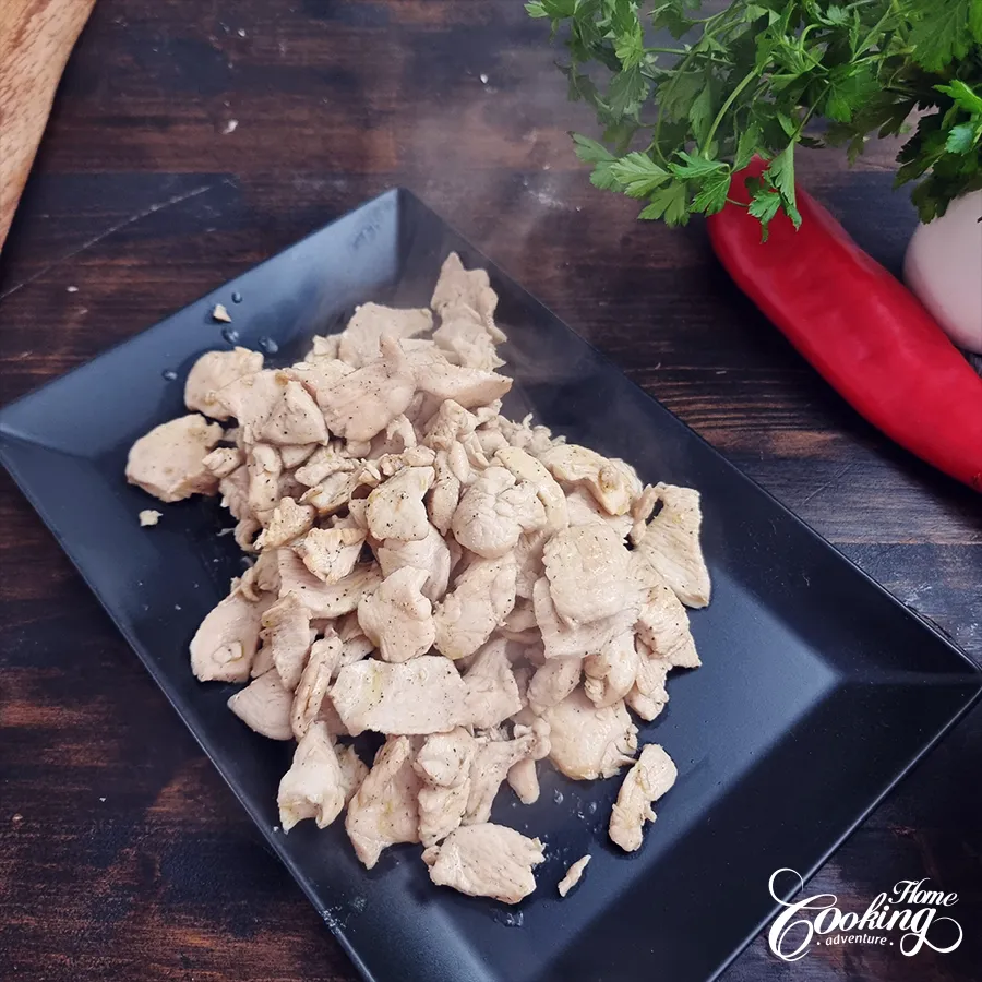 - Cut the chicken into thin slices.