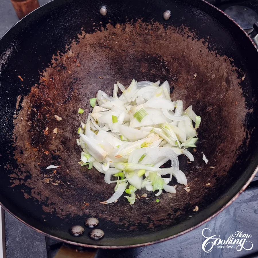 - Add remaining oil to the wok. Sauté the onion for 2–3 minutes until translucent.