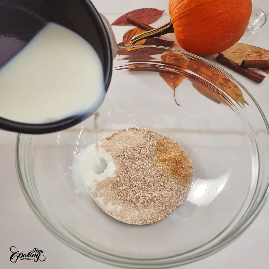 Begin with preparing the dough. In a medium bowl, mix together the yeast, 1 teaspoon (5g) sugar, and ¼ cup lukewarm milk. Let it rest for 5–10 minutes, until the yeast becomes foamy and activated.