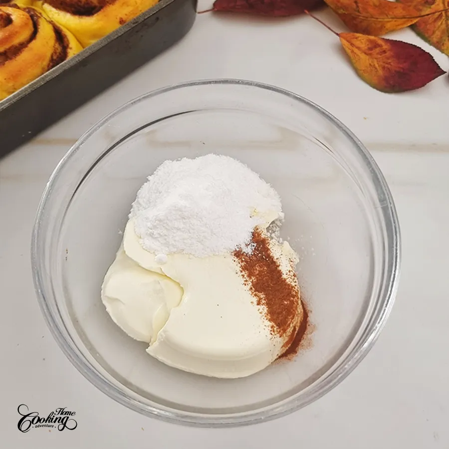 While the rolls bake, prepare the glaze. Mix together cream cheese, powdered sugar, and a hint of cinnamon until smooth.