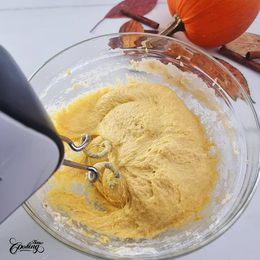 Add the rest of ingredients, flour, remaining sugar, salt, milk, eggs, pumpkin purée, vanilla extract, and melted butter.