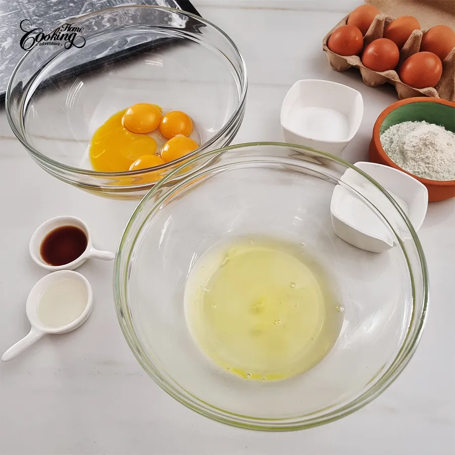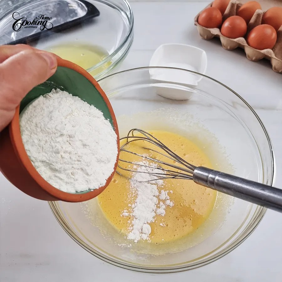 Add a pinch of salt to the egg whites. Beat until foamy, then gradually add the remaining ¼ cup (50 g) sugar, continuing to whip until stiff peaks form. Carefully and gradually fold the whipped egg whites into the yolk mixture, keeping as much air in the batter as possible.