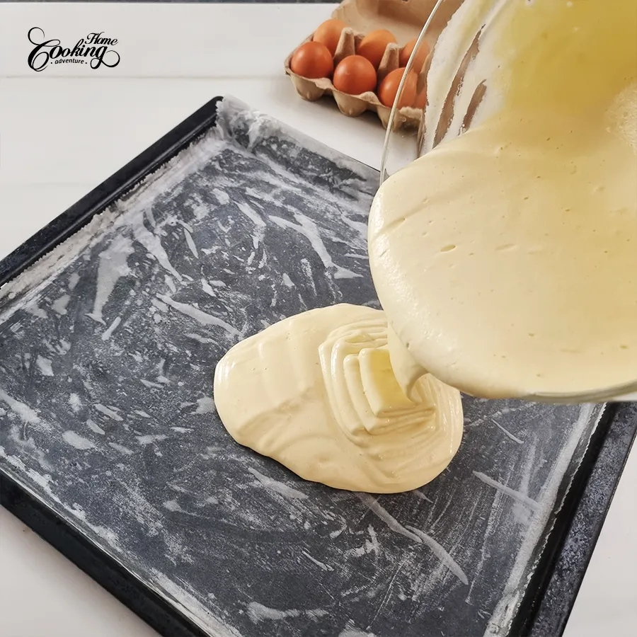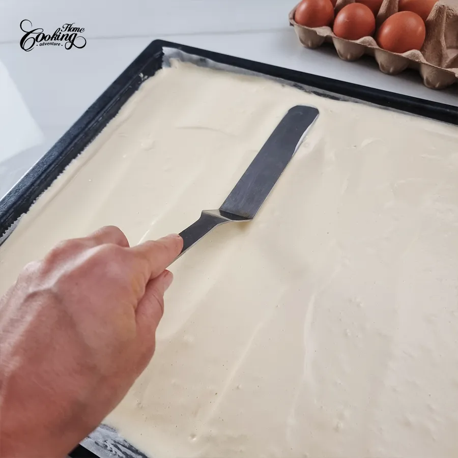 Pour the batter into the prepared baking sheet, spreading it evenly to the edges. Bake for 10–12 minutes, or until a toothpick inserted in the center comes out clean. Set aside to cool completely.