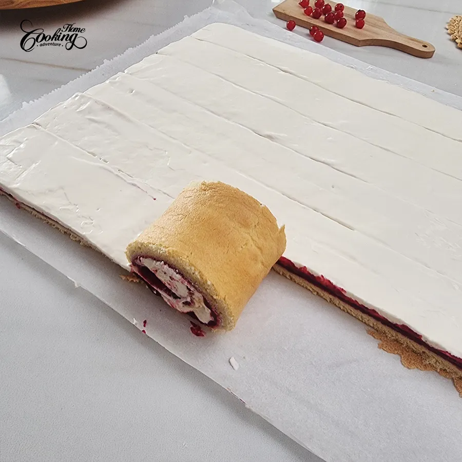 Next, spread the cream cheese frosting evenly over the cranberry layer. Freeze again for another 20 minutes to make rolling easier.